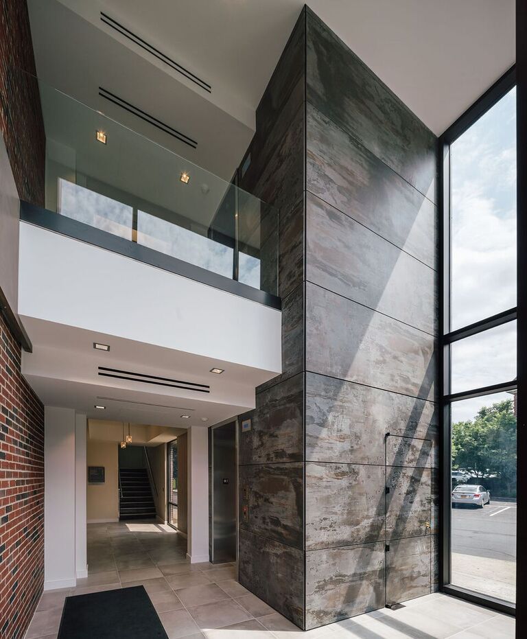 SRA added a new lobby addition to this 1960s-era office building, seamlessly merging old and new. The new, two-story glass enclosure and stone-clad elevator tower contrast with, yet complement, the structure’s original brick façade. The elevator tower is clad with oversized stone panels that continue to the interior of the lobby and conceal the mechanical room doors.