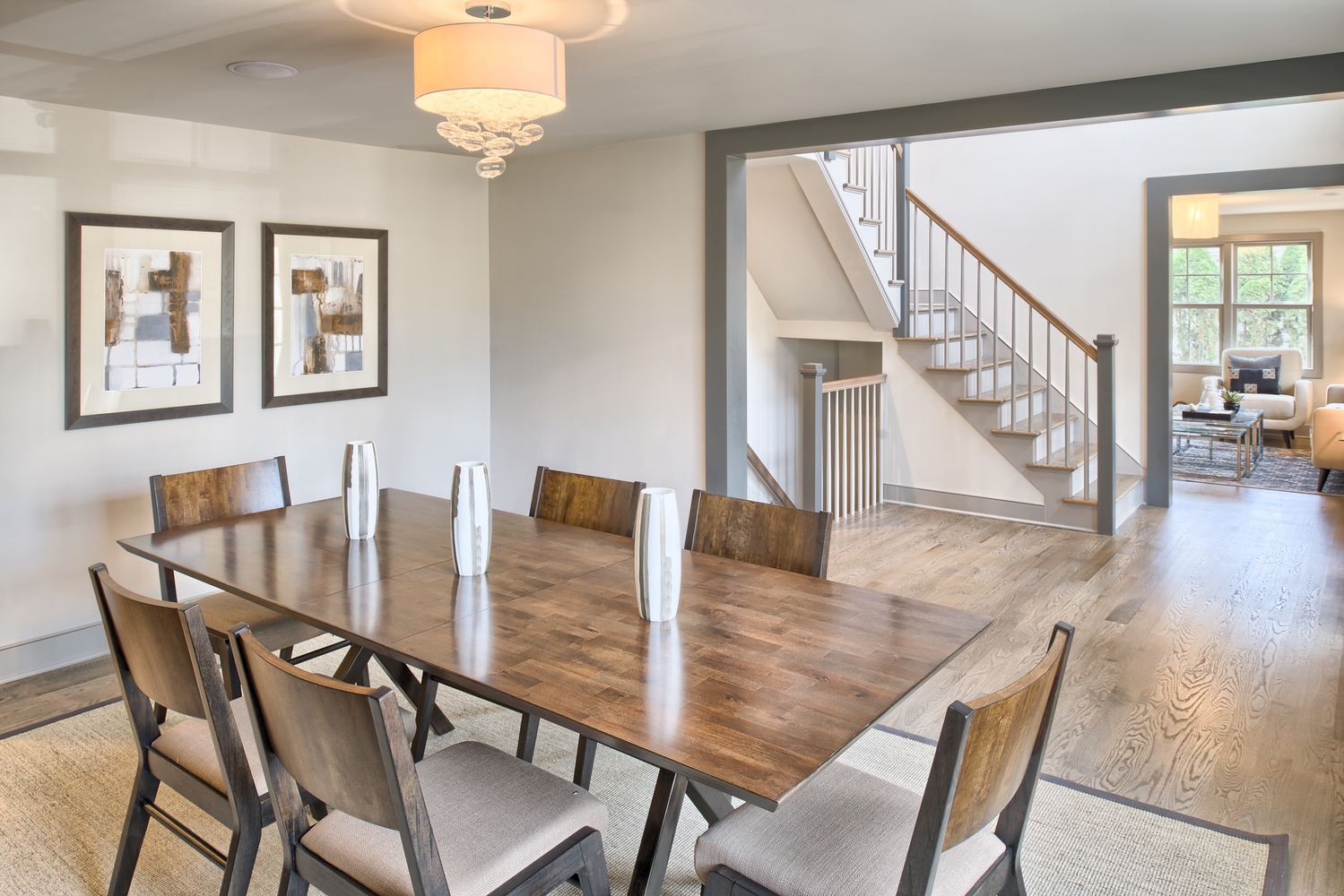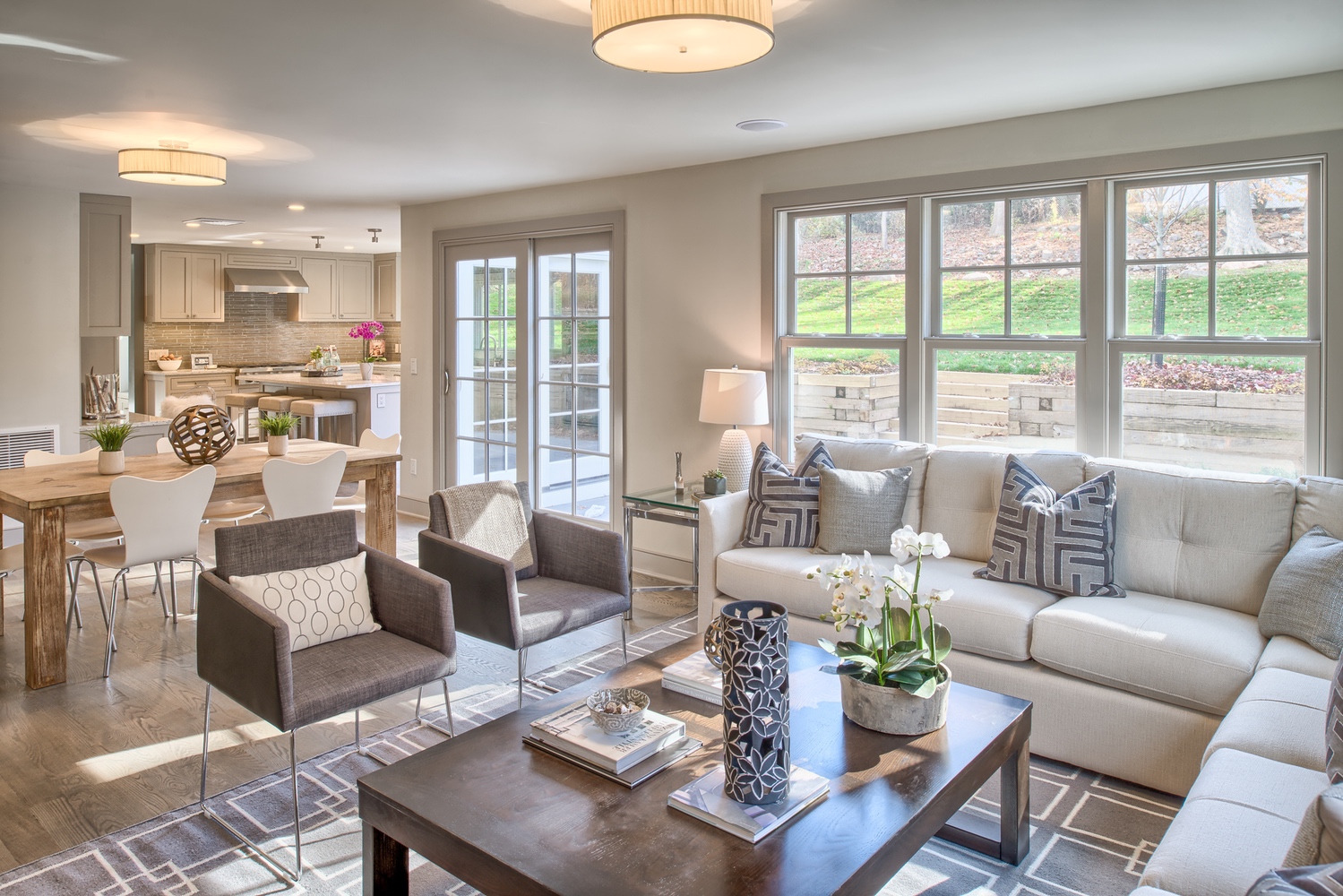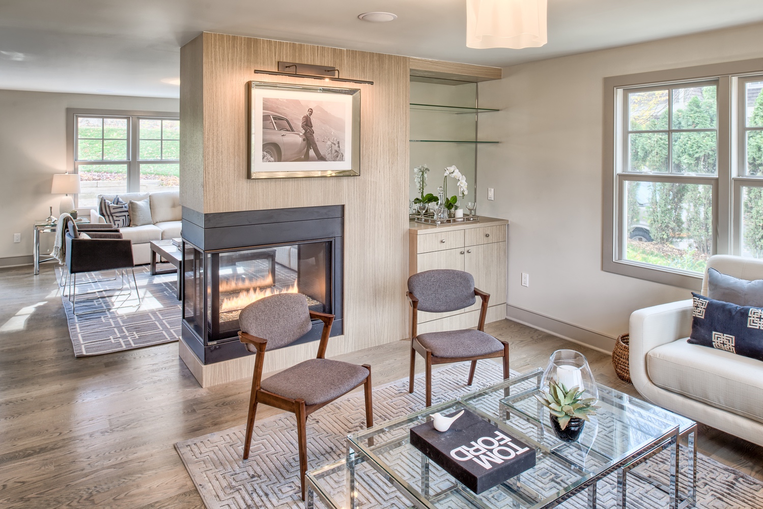 SRA gave this classic 1970s Colonial-style home an updated look inside and out. A redesigned roof line and new windows and siding refresh the exterior. The inside is updated with a gray-and-taupe palette, accented with a variety of wood tones, creates a soothing aesthetic.