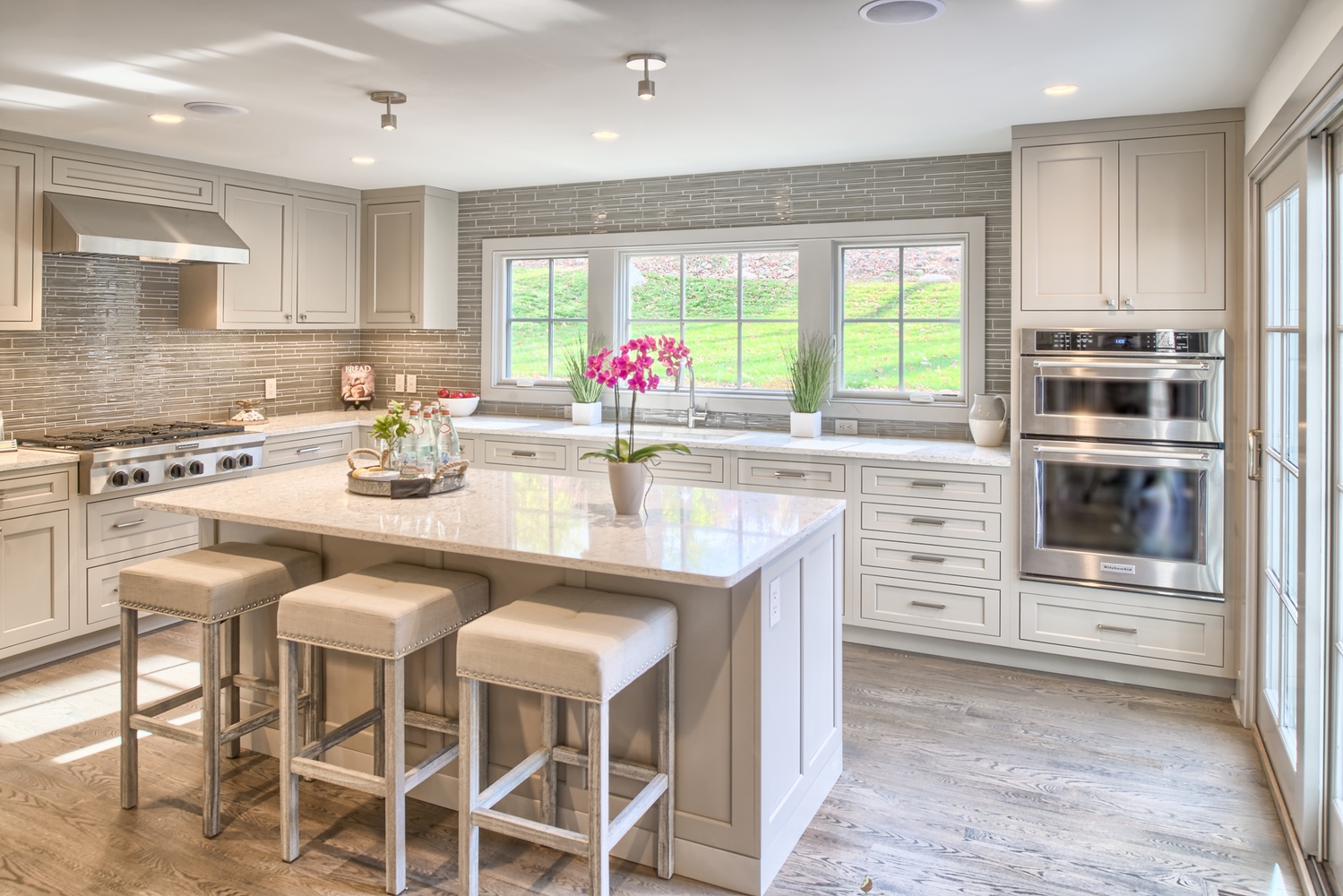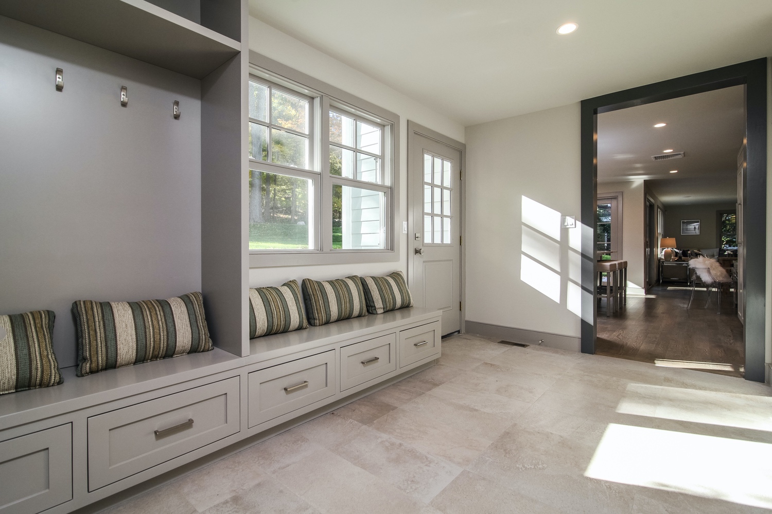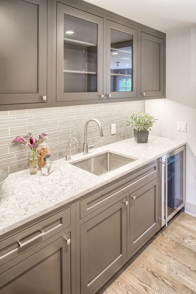 SRA gave this classic 1970s Colonial-style home an updated look inside and out. A redesigned roof line and new windows and siding refresh the exterior. The inside is updated with a gray-and-taupe palette, accented with a variety of wood tones, creates a soothing aesthetic.
