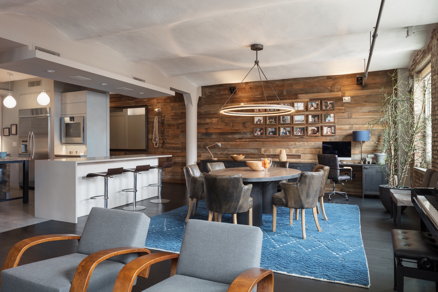 This primary residence was created in an 1887 pre-war downtown warehouse building. The couple and their family wanted to maintain the “loft style” space by preserving some of the original building elements – such as the exposed brick walls and metal sliding door in the primary bedroom. Contemporary accents work well alongside rustic touches and eclectic furniture to create a balanced aesthetic for this modern family.