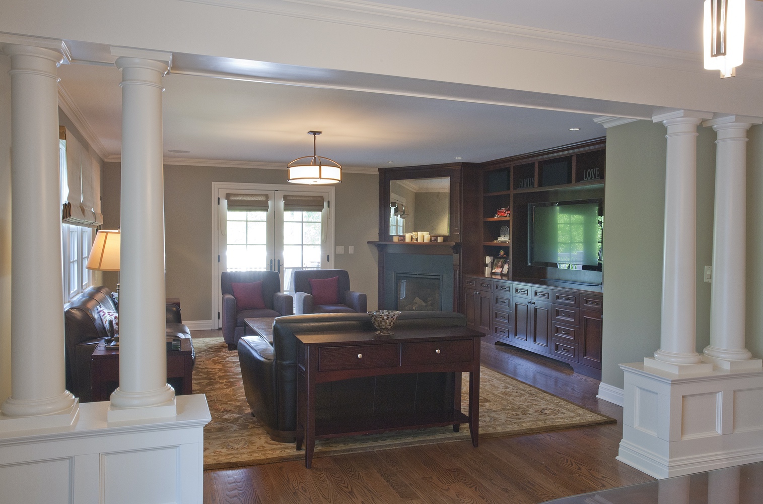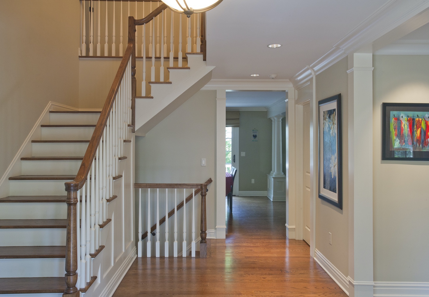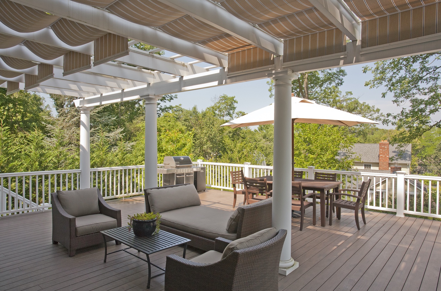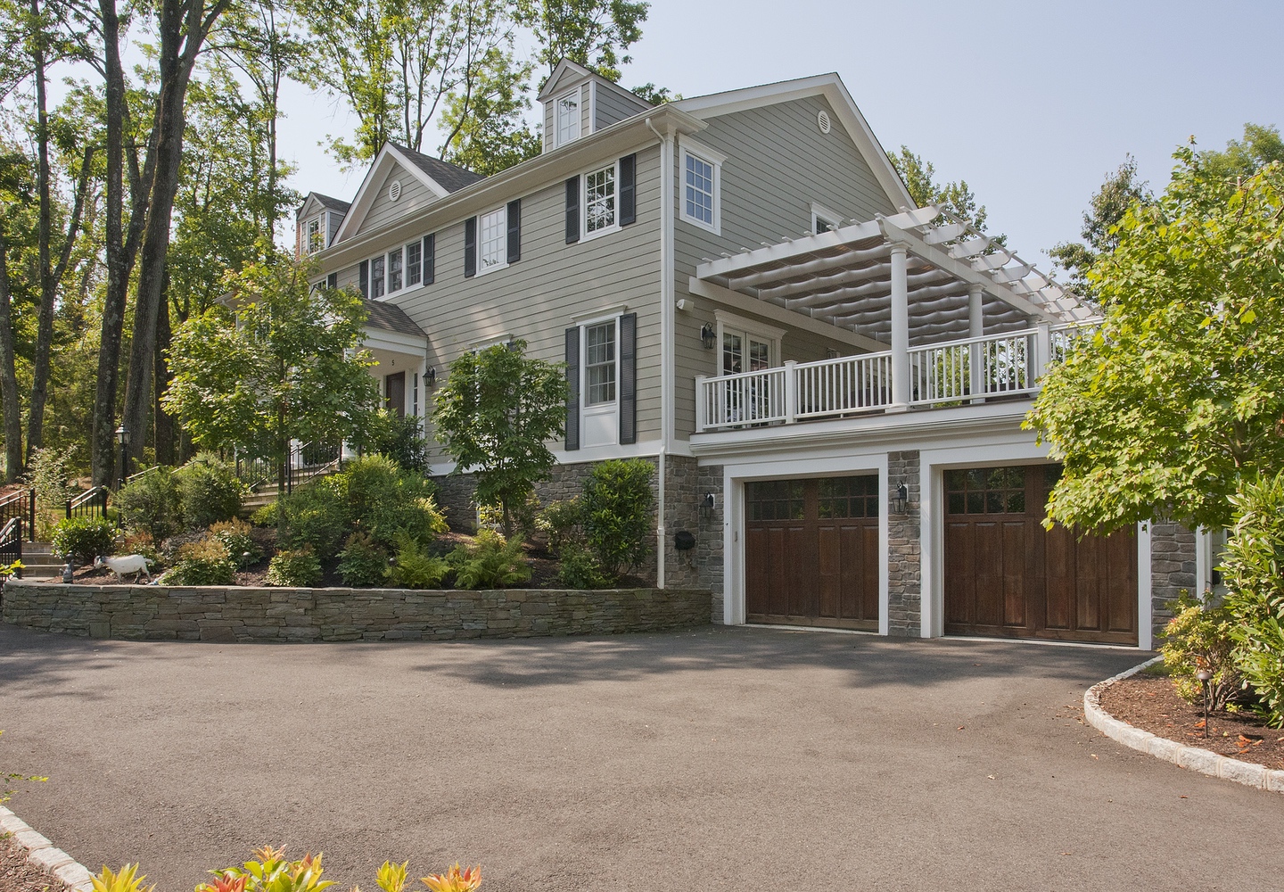 This former split-level home, originally constructed in the 1950s, was transformed into a center-hall, Colonial-style residence. The challenge for this project was to create outdoor living space on a modest property. We expanded the home by building a new 2-car garage topped with an outdoor gathering area on the roof forwhere the family can entertain. The large deck area leads to the family room, connecting the interior and exterior of the home despite the lack of buildable area. Automated shades on the pergola provide sun and rain protection to maximize outdoor enjoyment.