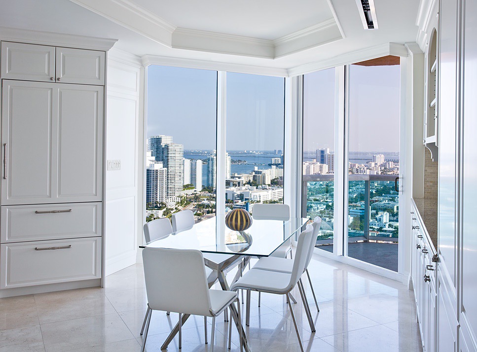 This project involved combining two apartments to create a spectacular a 5,000-square-foot residence at the tip of Miami Beach, FL. The apartment is lined with full-height windows overlooking South Beach. The expansive spaces feature copious built-in cabinetry, interesting millwork accents and sophisticated, contemporary furnishings. With 4 large bedrooms, each with an en-suite bathroom and walk-in closet, the finished apartment offers luxury living with glorious views of South Beach.