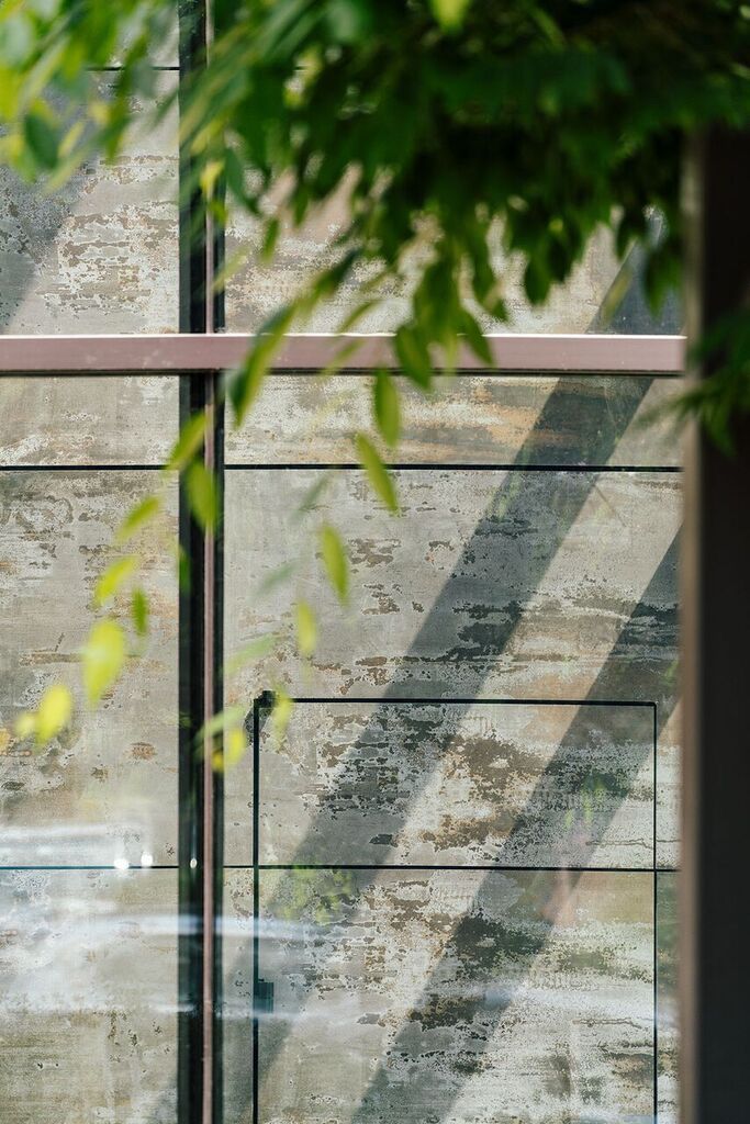 SRA added a new lobby addition to this 1960s-era office building, seamlessly merging old and new. The new, two-story glass enclosure and stone-clad elevator tower contrast with, yet complement, the structure’s original brick façade. The elevator tower is clad with oversized stone panels that continue to the interior of the lobby and conceal the mechanical room doors.