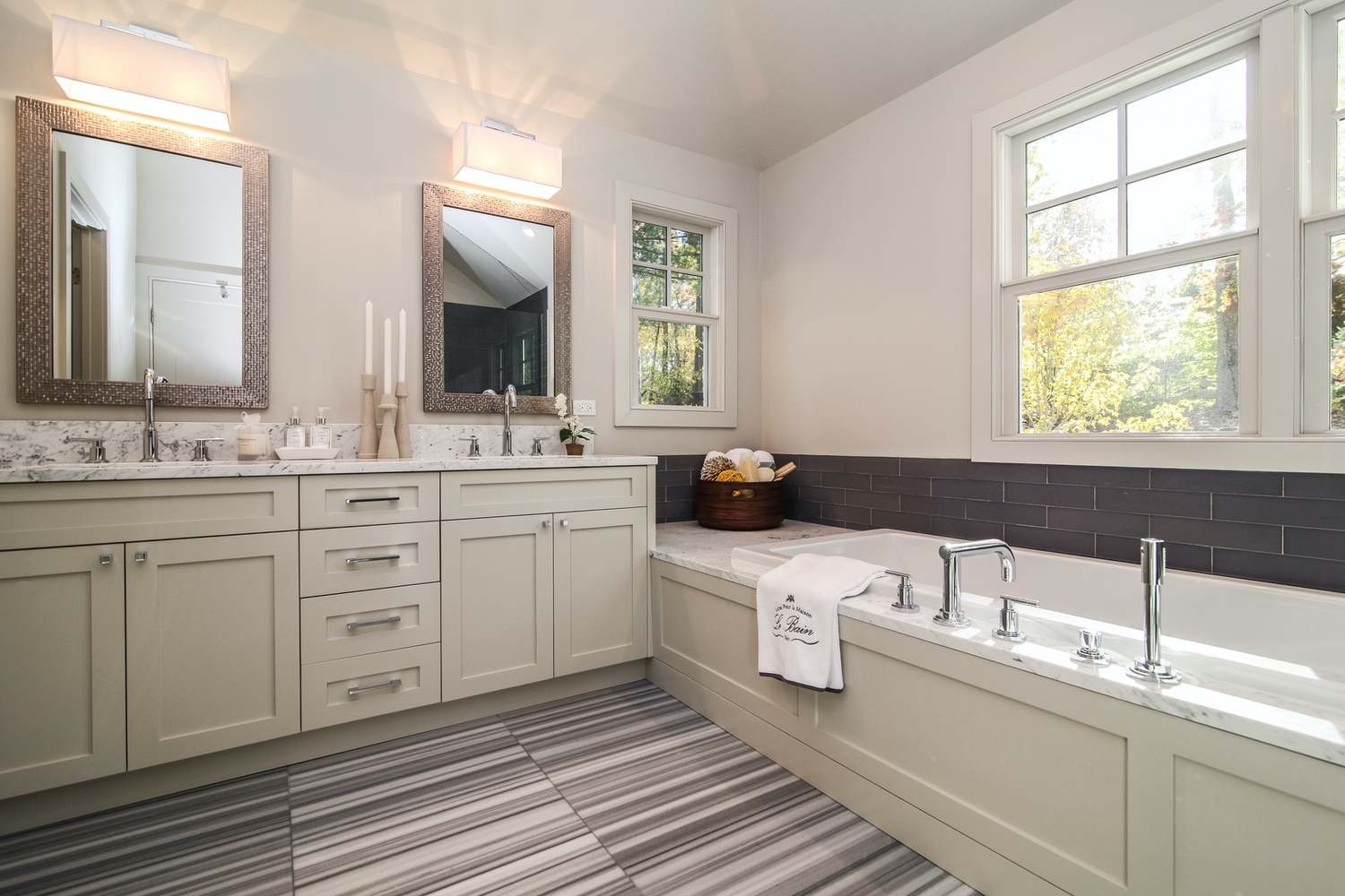 SRA gave this classic 1970s Colonial-style home an updated look inside and out. A redesigned roof line and new windows and siding refresh the exterior. The inside is updated with a gray-and-taupe palette, accented with a variety of wood tones, creates a soothing aesthetic.