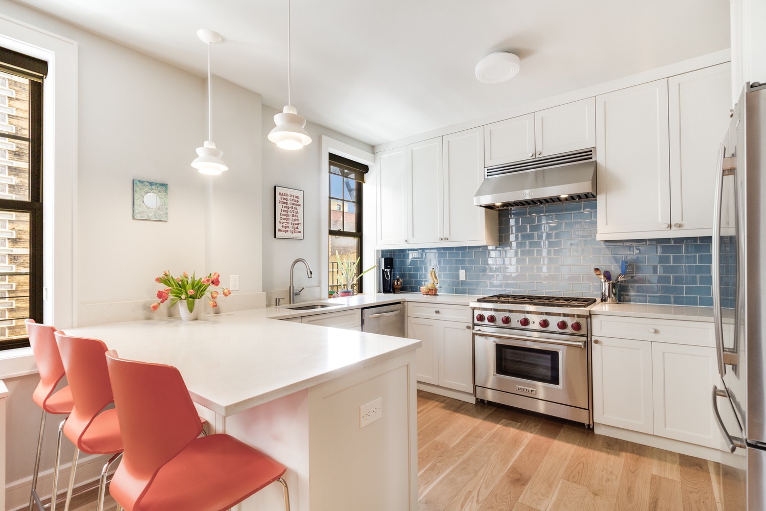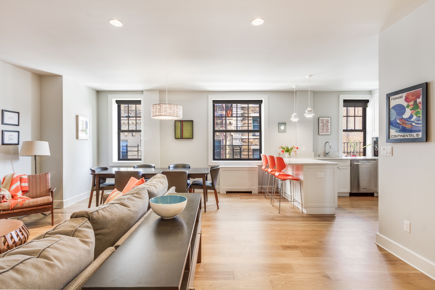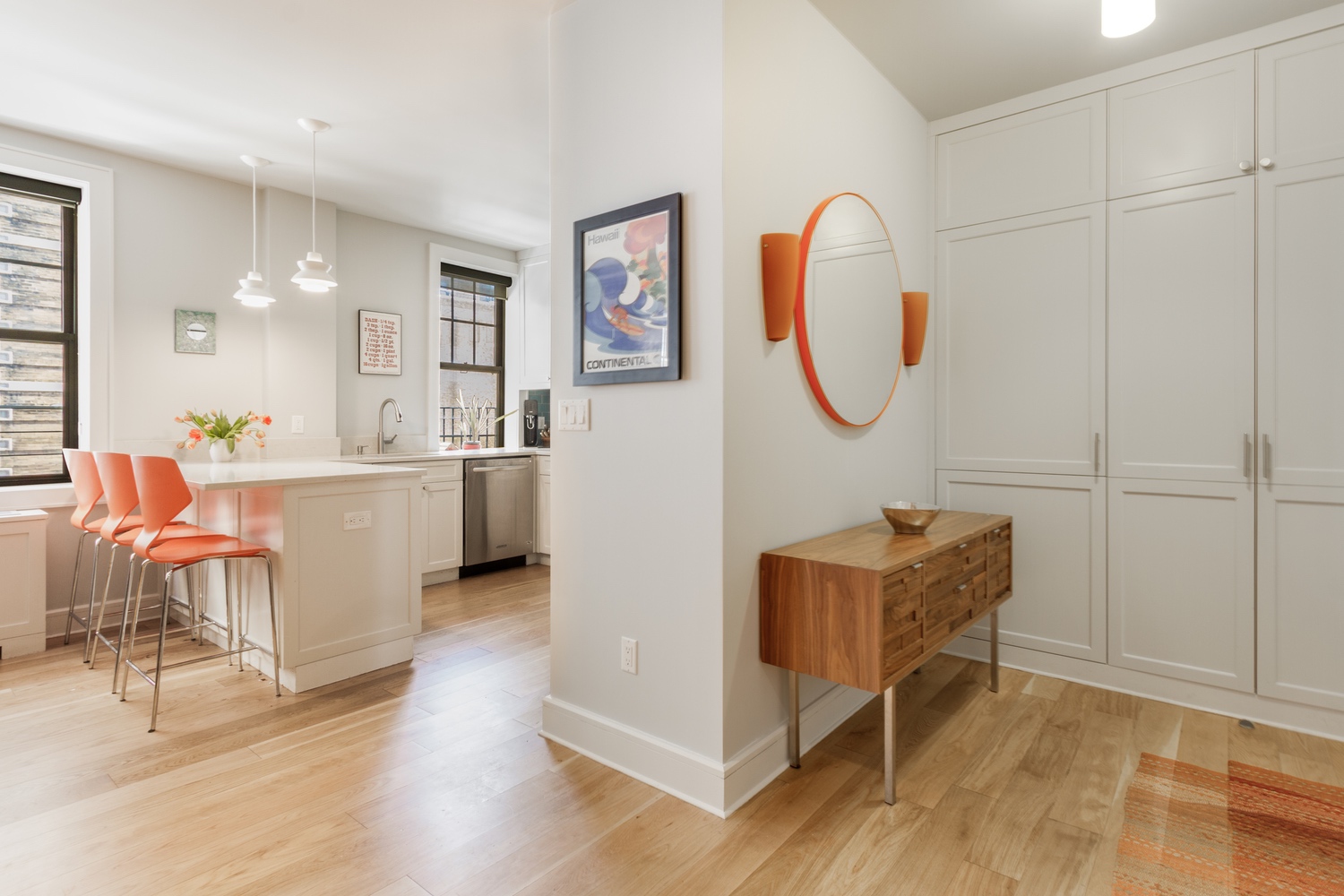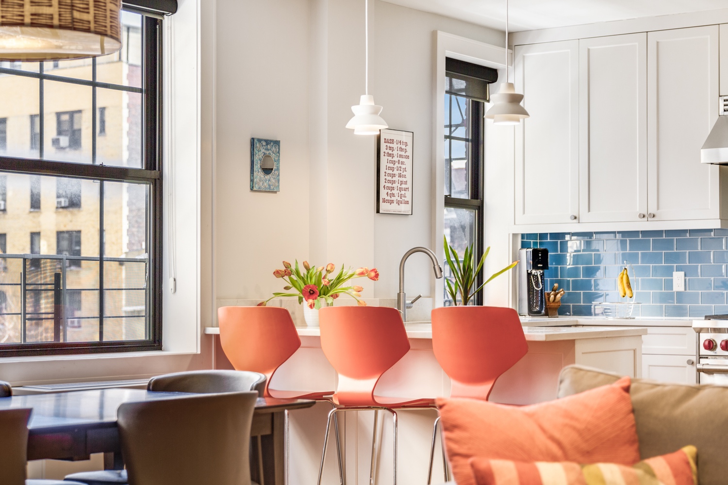 In an outer borough of New York City, two apartments in a pre-war building were joined to create this bright and airy space. We maximized the square footage by removing the wall that separated the apartments. The result was an open floor plan with distinct zones for cooking, dining and sleeping. The home is outfitted with midcentury-style furnishings accompanied by boldly colored accents to liven the primarily neutral décor.