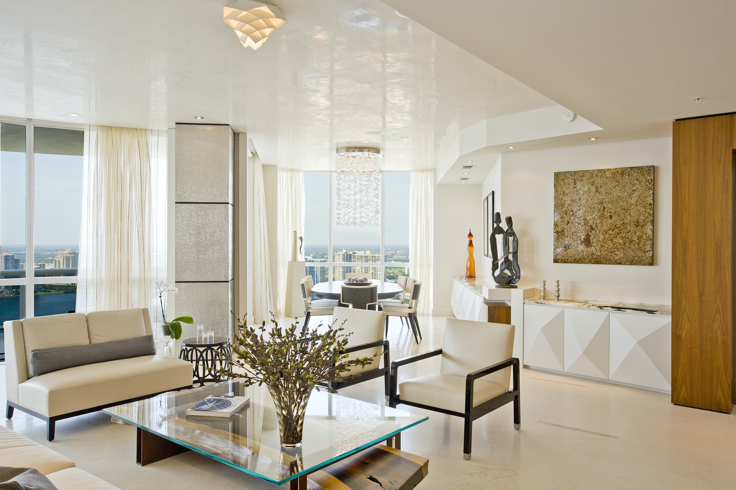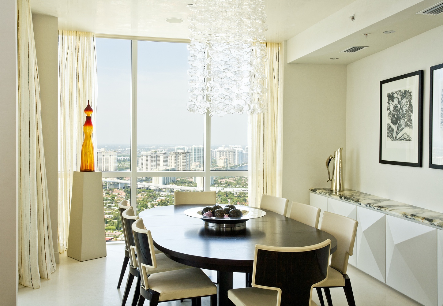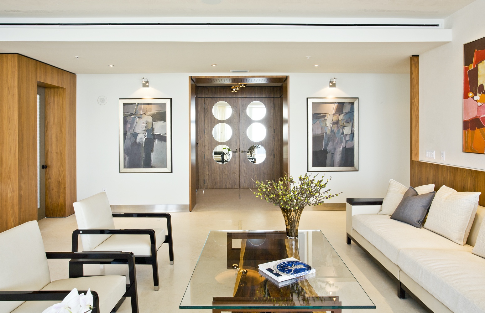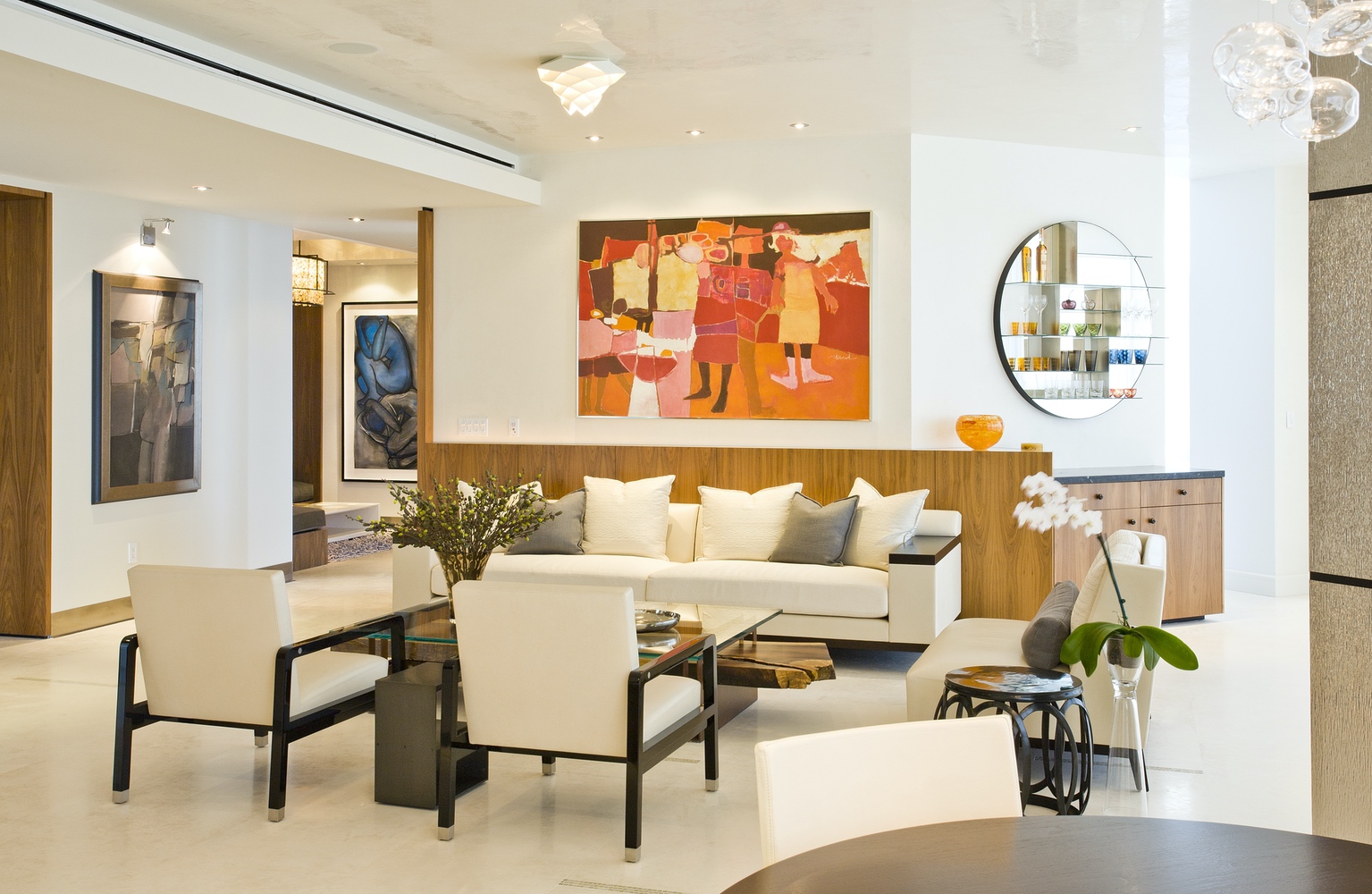 This 3,200-square-foot apartment feels much larger thanks to inspired modifications that maximize ocean-front views in Sunny Isle, FL. A family room and dining room were carved out of an existing single room, creating the illusion of a more expansive space. Walnut paneling and plaster walls help to draw focus to the owners’ collection of modern art. Streamlined, low-slung furnishings ensure warm, inviting and easily maintained spaces.