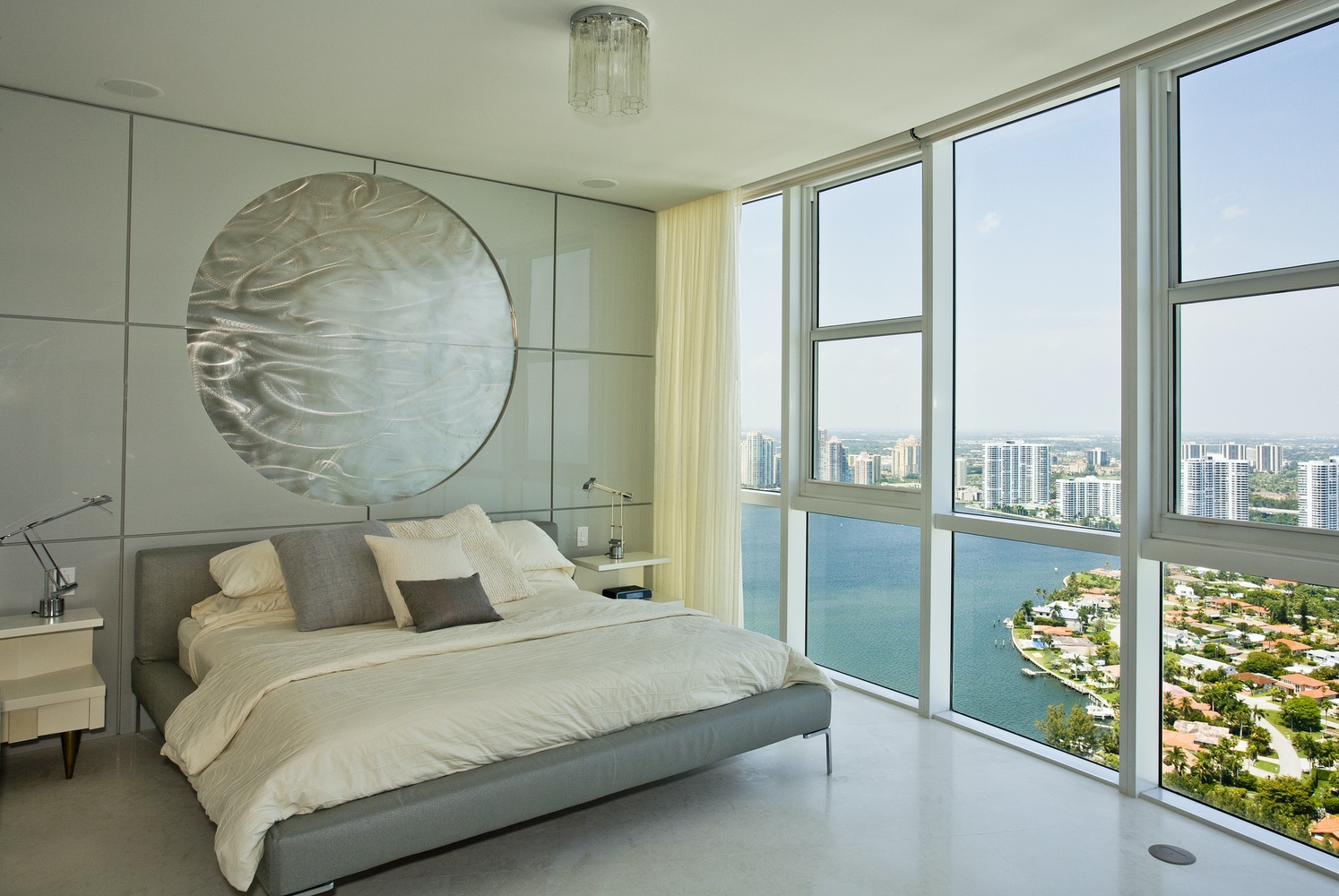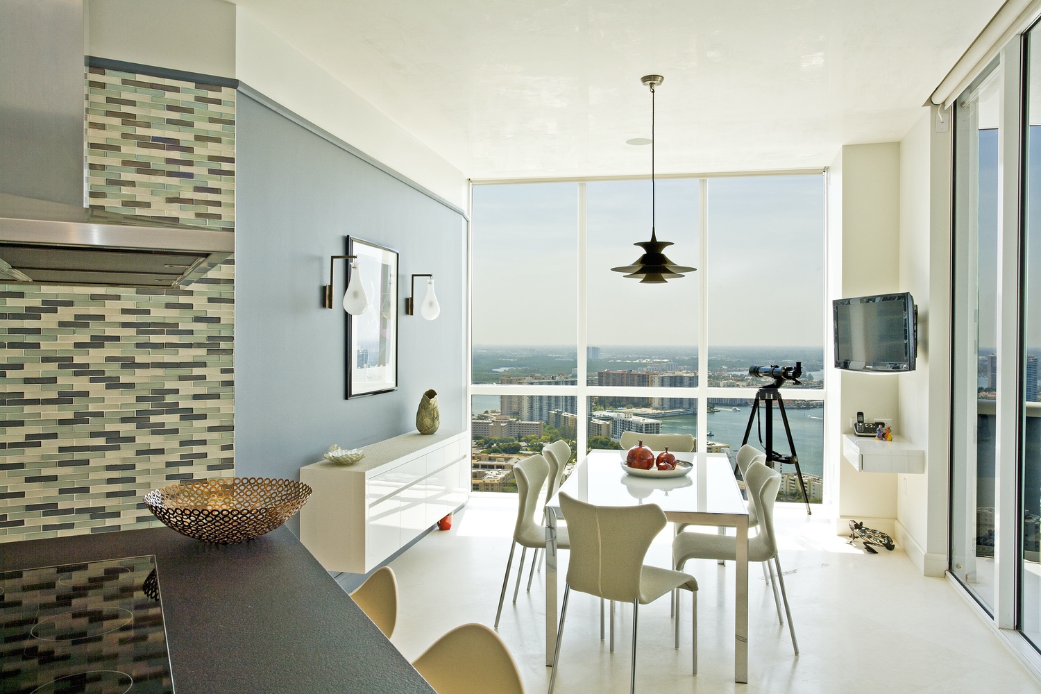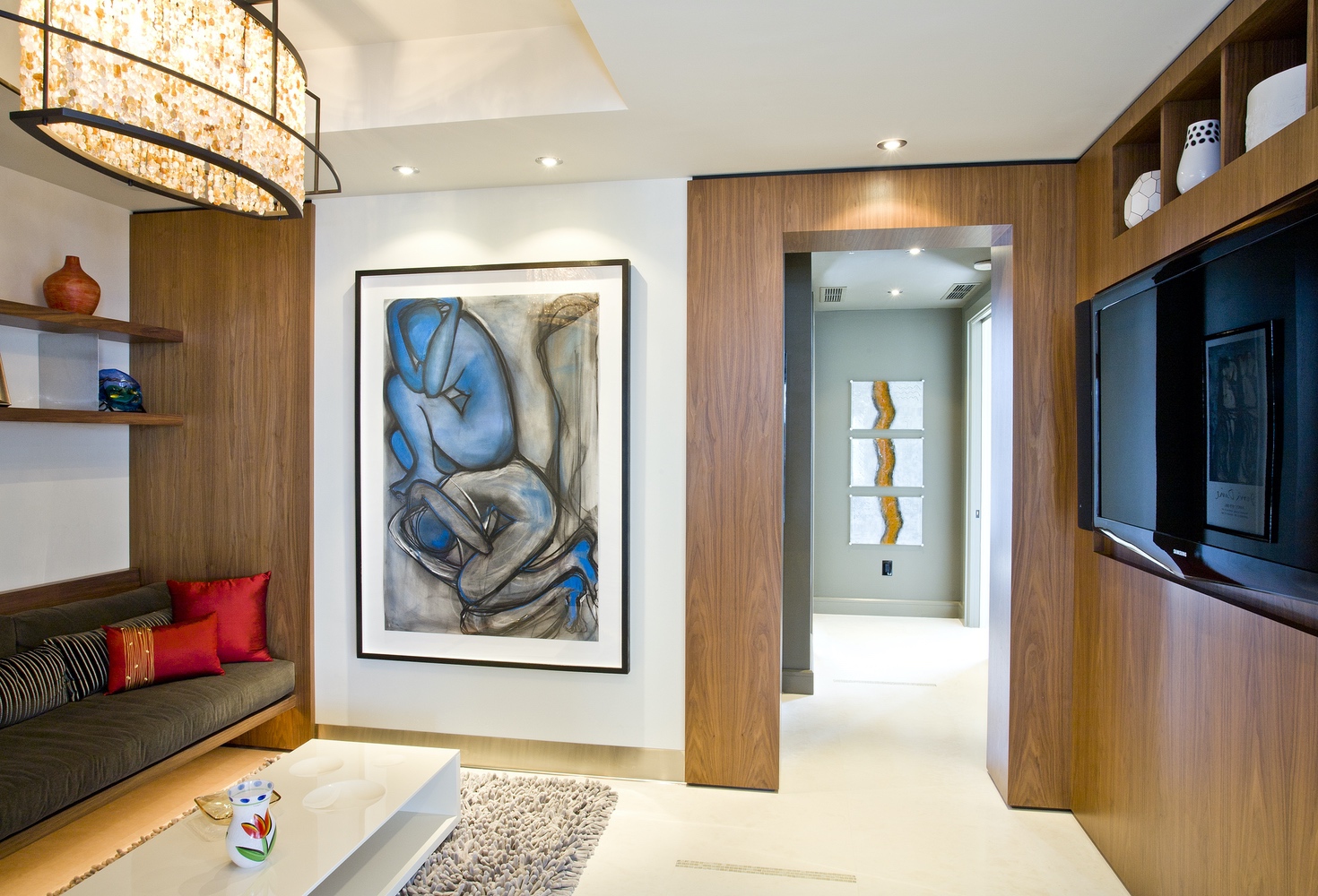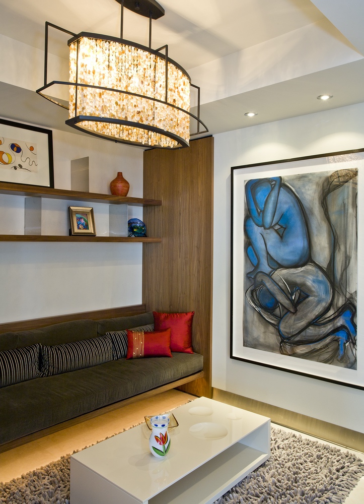 This 3,200-square-foot apartment feels much larger thanks to inspired modifications that maximize ocean-front views in Sunny Isle, FL. A family room and dining room were carved out of an existing single room, creating the illusion of a more expansive space. Walnut paneling and plaster walls help to draw focus to the owners’ collection of modern art. Streamlined, low-slung furnishings ensure warm, inviting and easily maintained spaces.