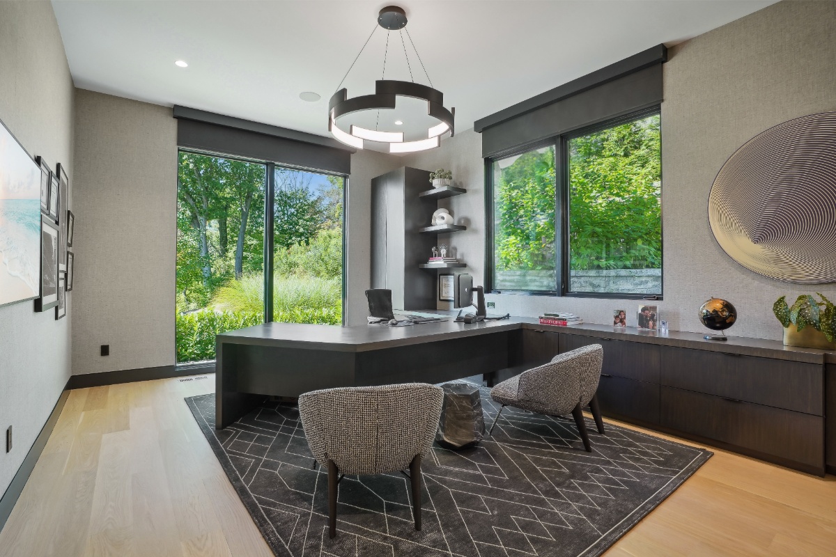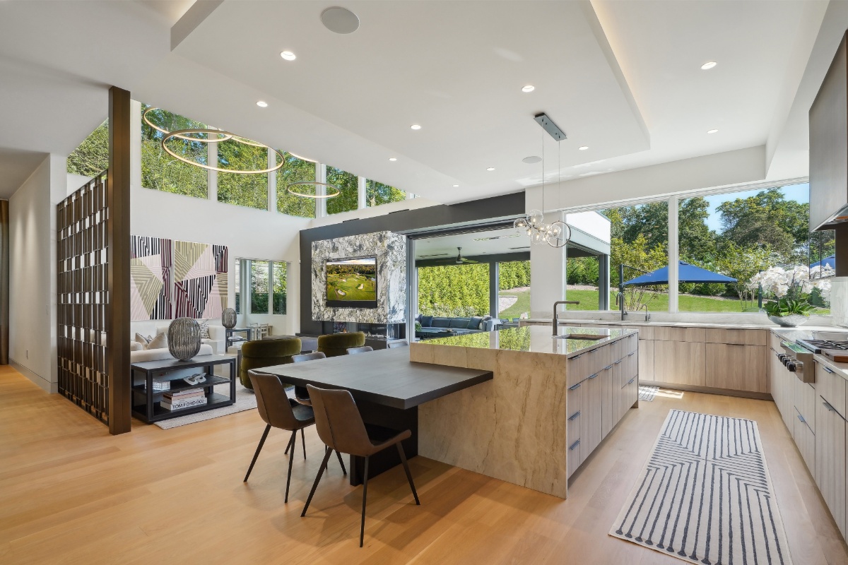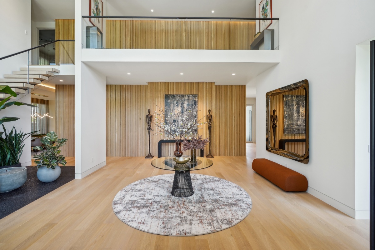 Poised atop a sloped site, this 12,000-square-foot modern residence embraces its challenging terrain with thoughtful design and environmental sensitivity. The bold stucco exterior, accented with natural wood and a sleek metal roof, is complemented by expansive glass windows that connect interior spaces to the landscape. A custom wood-paneled wall anchors the home’s center, while a floating steel staircase and double-height great room, punctuated by circular pendant lights, create moments of sculptural precision. A private office with a bespoke wood desk reflects the home’s balance of luxury and practicality. Outdoor spaces, including a covered porch with roll-down screens and a custom pool with spa, extend livability year-round, achieving a harmonious blend of innovation and comfort.