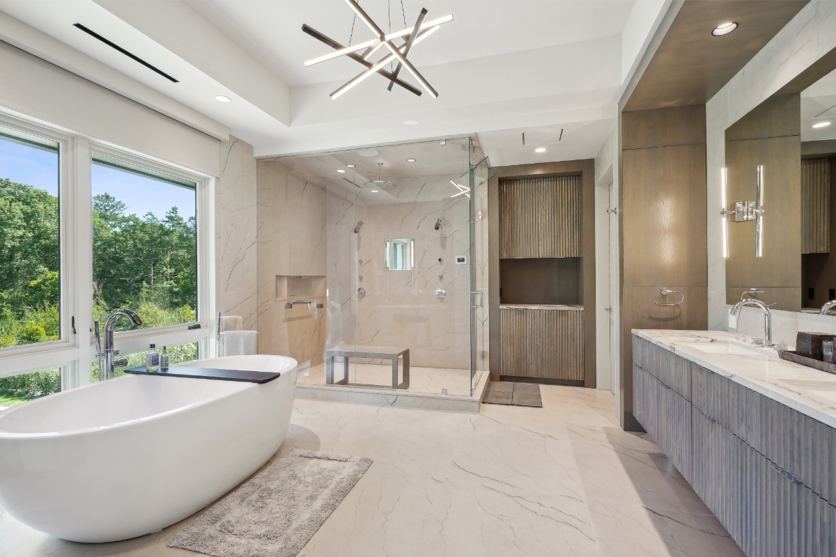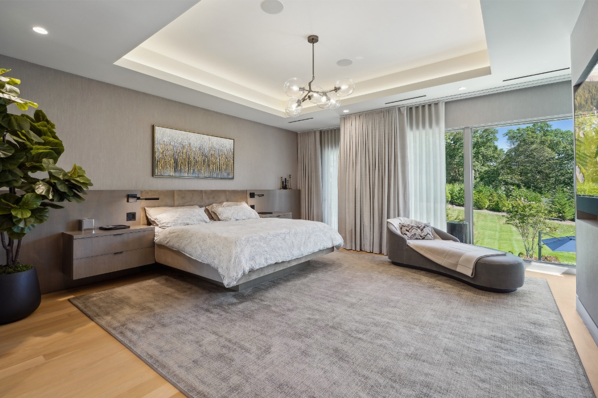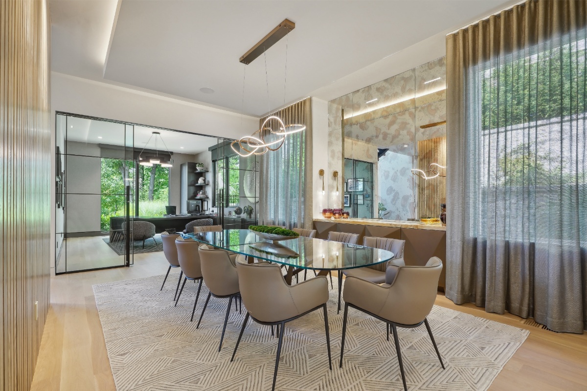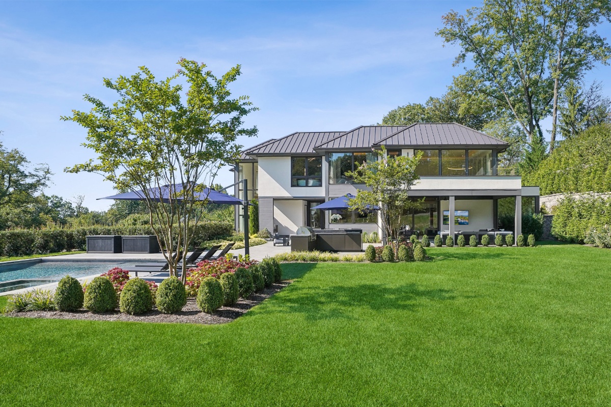 Poised atop a sloped site, this 12,000-square-foot modern residence embraces its challenging terrain with thoughtful design and environmental sensitivity. The bold stucco exterior, accented with natural wood and a sleek metal roof, is complemented by expansive glass windows that connect interior spaces to the landscape. A custom wood-paneled wall anchors the home’s center, while a floating steel staircase and double-height great room, punctuated by circular pendant lights, create moments of sculptural precision. A private office with a bespoke wood desk reflects the home’s balance of luxury and practicality. Outdoor spaces, including a covered porch with roll-down screens and a custom pool with spa, extend livability year-round, achieving a harmonious blend of innovation and comfort.