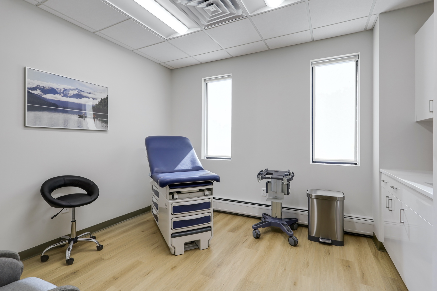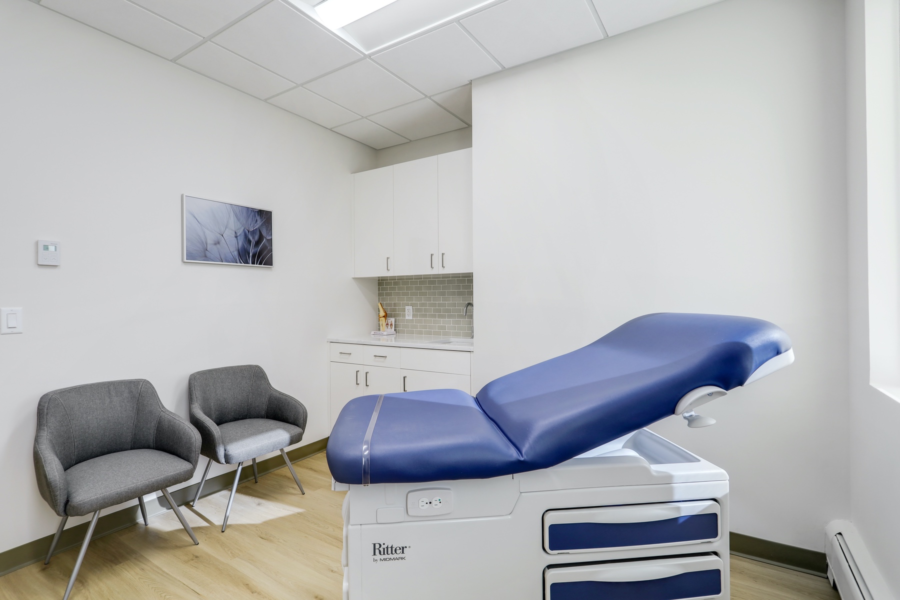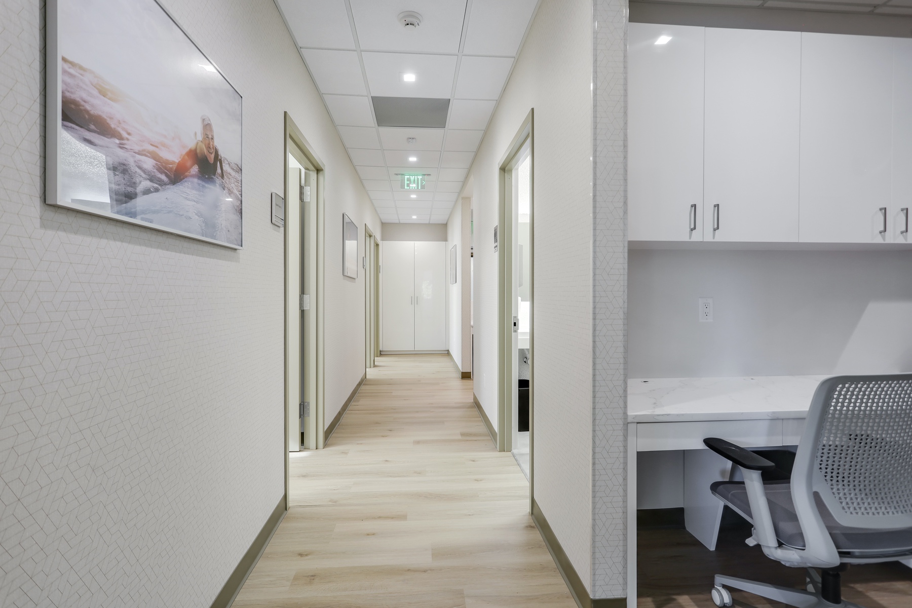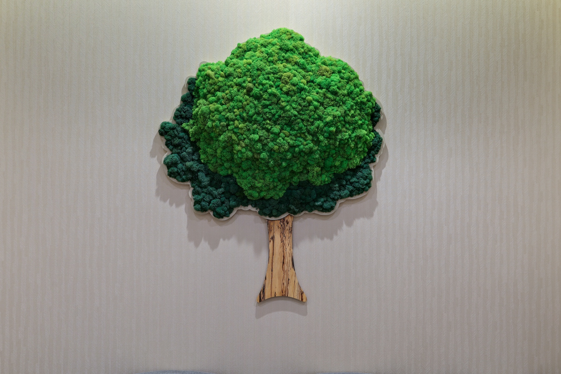 This state-of-the-art facility combines cutting-edge medical technology with a soothing environment to help patients feel confident and at ease in their surroundings. White oak floors provide warmth while the wood feature wall behind the reception desk offers a soothing nod to nature. The waiting area is highlighted by a custom live-moss art sculpture in the shape of the facility’s tree logo.