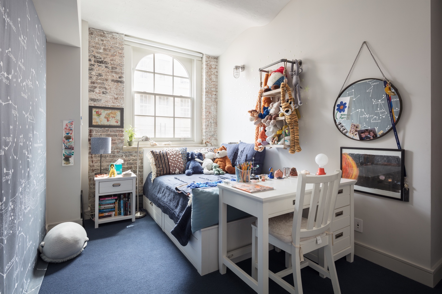 This primary residence was created in an 1887 pre-war downtown warehouse building. The couple and their family wanted to maintain the “loft style” space by preserving some of the original building elements – such as the exposed brick walls and metal sliding door in the primary bedroom. Contemporary accents work well alongside rustic touches and eclectic furniture to create a balanced aesthetic for this modern family.