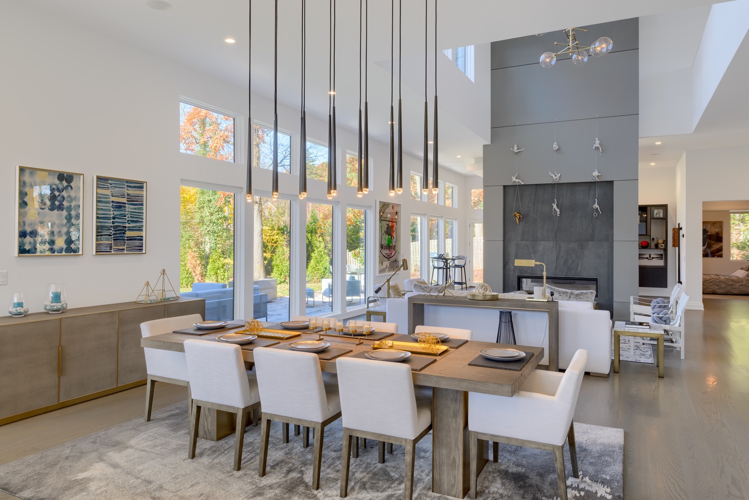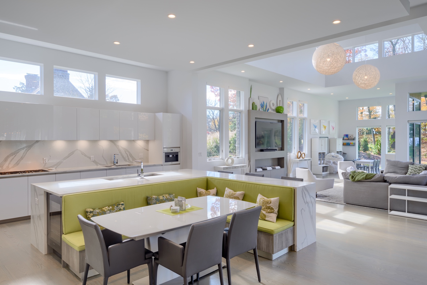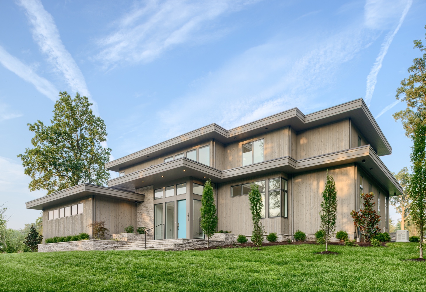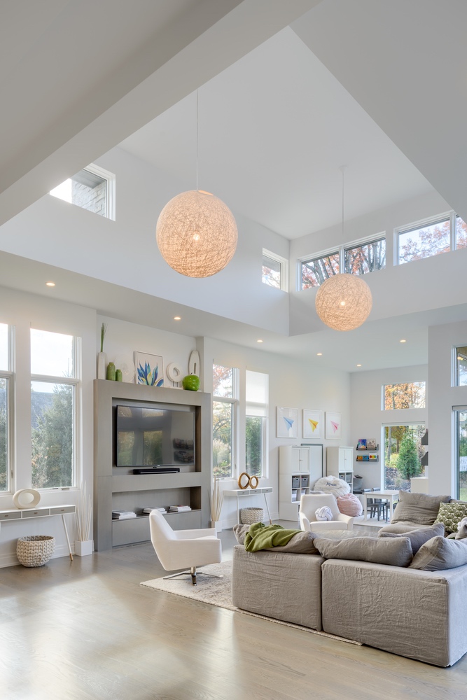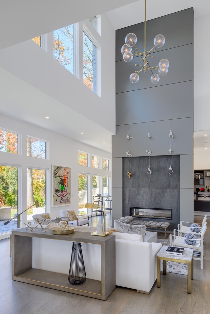 A contemporary residence situated atop a hill in a historical section of town, Hillside was artfully designed to fulfill the clients’ wishes for a modern home while acknowledging and honoring the vintage houses surrounding it. SRA worked with the town board to satisfy their requirements while creating a structure with a subtle, yet stunning presence. Wood clapboard on the exterior is a nod to the historical provenance of the neighborhood; however, it is mounted vertically for a more contemporary look. The interiors have a very modern aesthetic with streamlined, linear furnishings and fixtures, which unite to create, essentially, a white envelope of space accented with pops of color and metallic finishes to accentuate the home highlights.