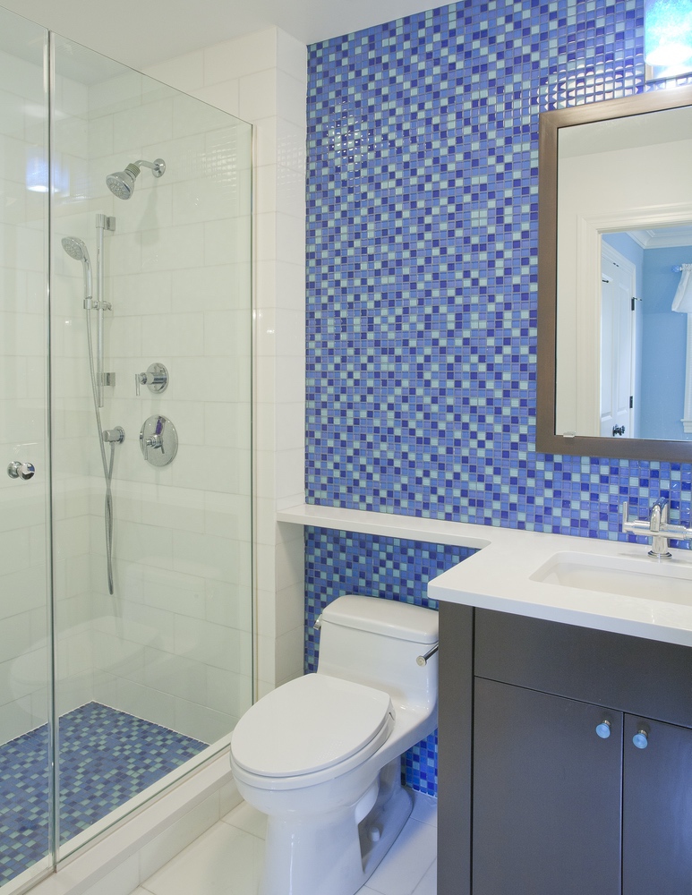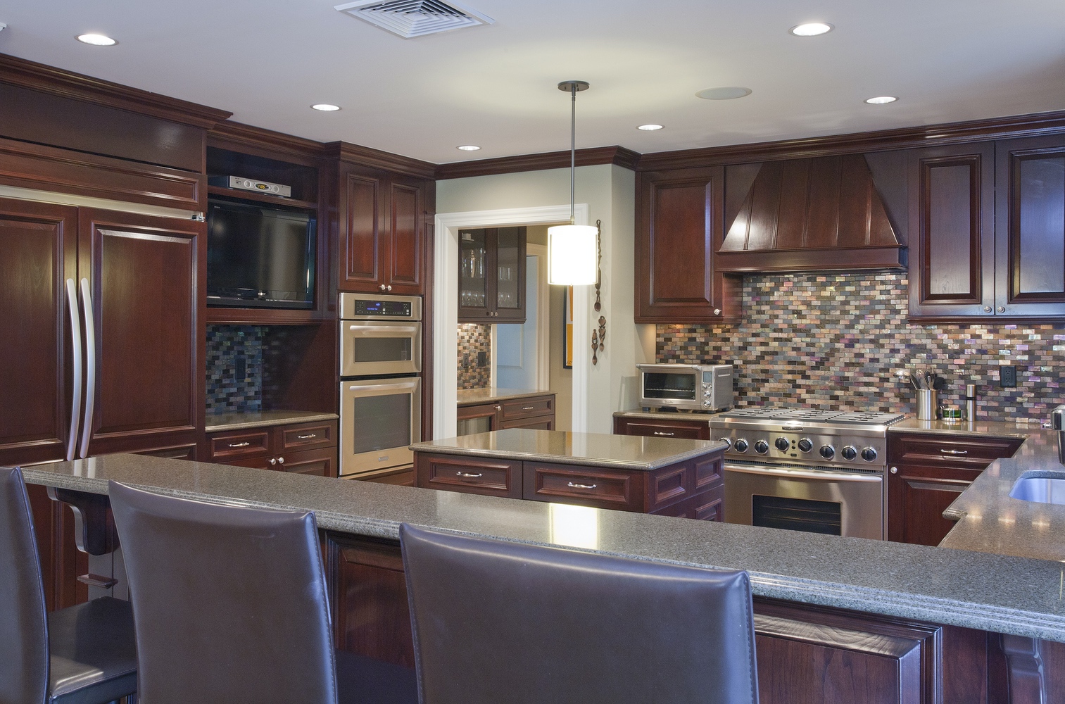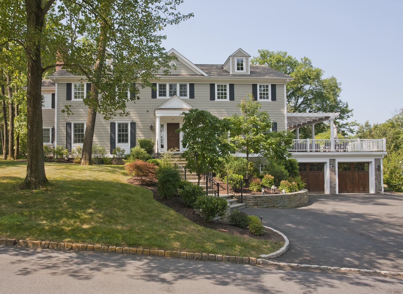 This former split-level home, originally constructed in the 1950s, was transformed into a center-hall, Colonial-style residence. The challenge for this project was to create outdoor living space on a modest property. We expanded the home by building a new 2-car garage topped with an outdoor gathering area on the roof forwhere the family can entertain. The large deck area leads to the family room, connecting the interior and exterior of the home despite the lack of buildable area. Automated shades on the pergola provide sun and rain protection to maximize outdoor enjoyment.
